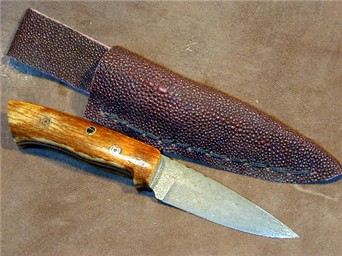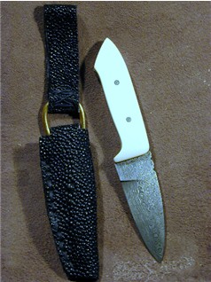 Picture 2 Handle: Mammoth Bone, Mosaic pins Blade: Damascus Size: 6 1/2" overall, 3" blade Stingray Skin Sheath Price: SOLD Item 3-2 |