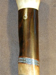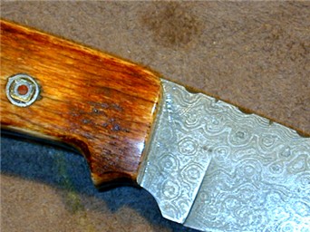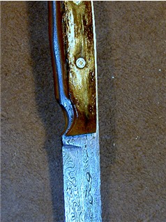 Picture 2 Handle: Mystery wood, Mammoth Bone, Hippo Ivory Blade: Roger Bergh handforged Damascus Size: 7 1/2" overall, 3" blade Price: SOLD Item 3-3 |