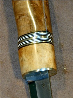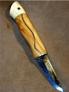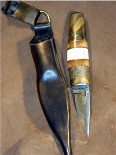 Picture 2 Handle: Myrtle Burl, Walrus oosik, Nickelsilver and fiber spacers Blade: Björkman handforged Size: 7 1/4" overall, 2 3/4" blade Price: SOLD Item 3-4 |
