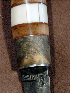 Picture 2 Handle: Giraffe Bone and grey fiber spacers. Mosaic pins Blade: Damascus with filework Size: 8" overall, 3 1/4" blade Stingray sheath Price: SOLD Item 3-8 |
