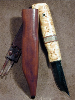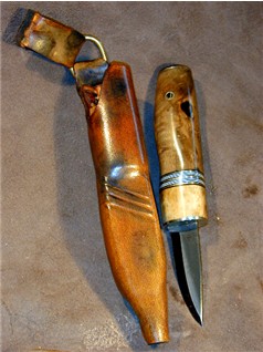 Picture 2 Handle: Curly Birch, Nickelsilver and red fiber spacers, Michigan Petoskey Stone Blade: Lauri Finnish Stainless Size: 7 3/4" overall, 3" blade Leather sheath with wood liner Price: SOLD Item 3-10 |