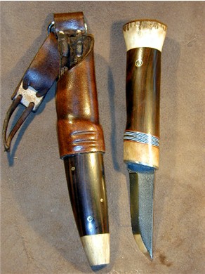 Picture 2 Handle: Sriped Ebony, Moose antler, Walrus oosik, Nickelsilver and red fiber spacers Blade: Björkman handforged Size: 8" overall, 3" blade Striped Ebony, Moose antler and leather sheath with brass and mosaic pins Price: SOLD Item 3-5 |