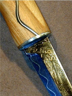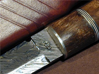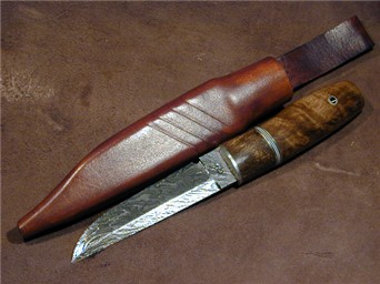 Picture 2 Handle: Myrtle Burl, Nickelsilver and black and white fiber spacers, Mammoth bone Blade: André Andersson Startwist Damascus Size: 9" overall, 4" blade Leather sheath with wood liner Price: SOLD Item 3-9 |
