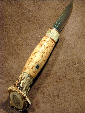 Picture 2 Handle: Curly Birch, Deer Antler, Nickelsilver and red fiber spacers, Scrimshaw Deer Hoof Print Blade: Johan Gufstafsson handforged Damascus with filework Size: 8" overall, 2 9/16" blade Leather sheath with wood liner Price: SOLD Item 3-7 |