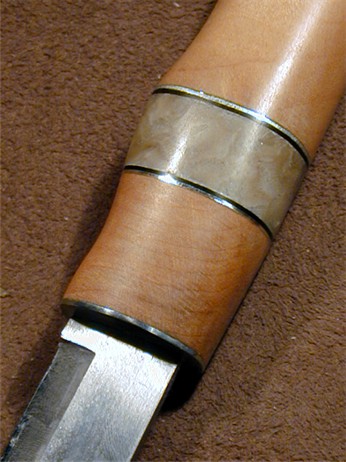 Picture 2 Handle: Curly Birch, Petoskey Stone, and Nickle Silver and red spacers Blade: Finnish Lauri Size: 7 3/4" overall, 3" edge Price: SOLD Item 4-4 |