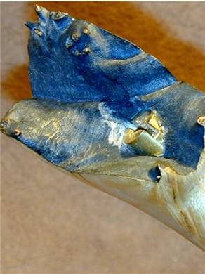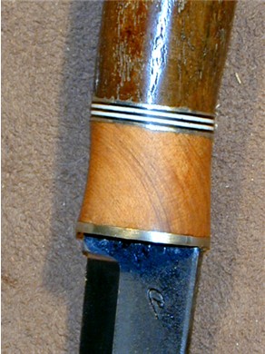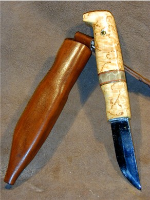 Picture 2 Handle: Spalted Birch with inlayed Racoon penile bone Blade: Finnish Lauri Size: 9" overall, 3 3/4" edge Price: SOLD Item 4-2 |