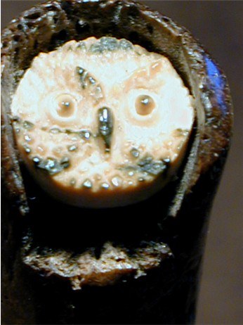 Picture 2 Picture 3 Handle: Mammoth Bone and Thuya burl with an inlayed carved owl face Blade: Norwegian Brusletto Size: 8 1/4" overall, 3" edge Price: SOLD Item 4-3 |
