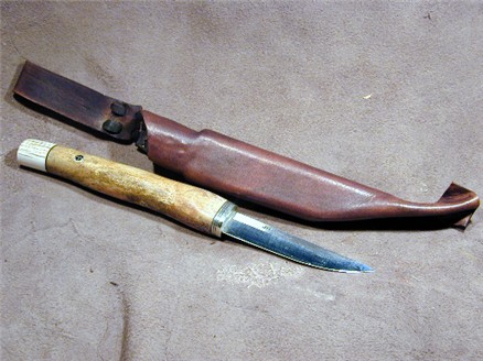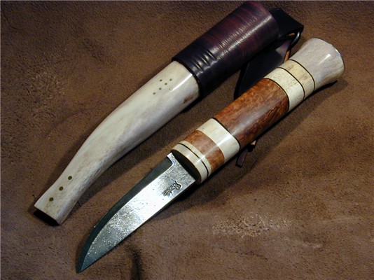 Picture 2 Handle: Walrus Oosik, Elk antler, Nickle Silver and black spacers Blade: Hankala Tommi Size: 9 1/2" overall, 3" edge Price: $135 SOLD Item 4-7 |