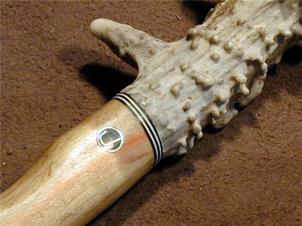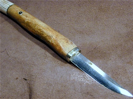 Picture 2 Handle: Whitetail Deer antler, Flamed Box Elder, Blade: Handforged Hakkarainen Size: 10" overall, 3" edge Price: $140.00 SOLD Item 4-10 |